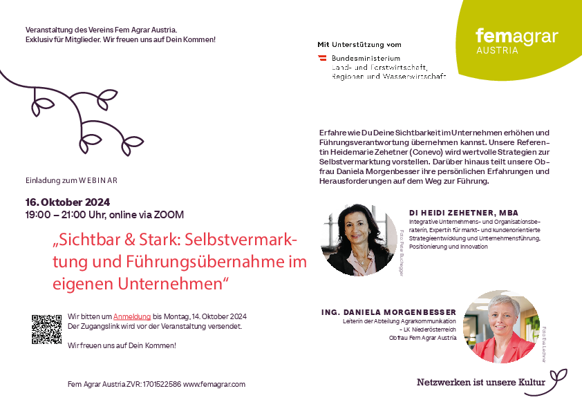 Fem Agrar Austria lädt Dich herzlich zum dritten Webinar 2024 ein. Unter dem Motto „Sichtbar & Stark: Selbstvermarktung und Führungsübernahme im eigenen Unternehmen“ setzen wir unser Jahresthema „Frauen stärken, sichtbarmachen, Selbstvermarktung, in die Führungsrolle gehen“ fort.